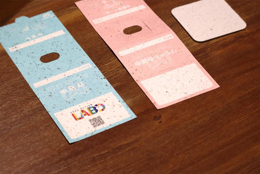 紙の専門商社として1899 年の創業以来、多種多様な紙を取り扱っている「株式会社 竹尾」と連携し、廃棄野菜を使った混抄紙、お米を使った混抄紙、コーヒー豆の皮を使った混抄紙など最適な混抄紙を提供します。